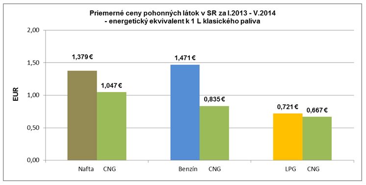 CNG je dlhodobo ekonomicky najvýhodnejším motorovým palivom v SR. Oproti benzínu dosahuje finančnú úsporu až 43 %. Pre správne porovnanie ekonomiky CNG a klasických palív je potrebné používať priemerné ceny palív za minimálne obdobie 12 mesiacov. Základnou predajnou jednotkou CNG je 1 kg, ktorý však má v porovnaní s bežnými PHM väčšiu energetickú hodnotu. Orientačne 1 kg CNG predstavuje 1,14 l nafty, 1,43 l benzínu a 1,75 l LPG. Prepočet na jednotku klasického paliva (1 l) hovorí, že v porovnaní s naftou (priemerná cena: 1,379 eura) by ste zaplatili v prípade CNG za liter iba 1,047 eura. Oproti benzínu, ktorého priemerná cena je 1,471 eura, dokonca iba 0,835 eura. V porovnaní s LPG, ktorého priemerná cena je 0,721 eura, by ste v prípade CNG zaplatili 0,667 eura za liter paliva.