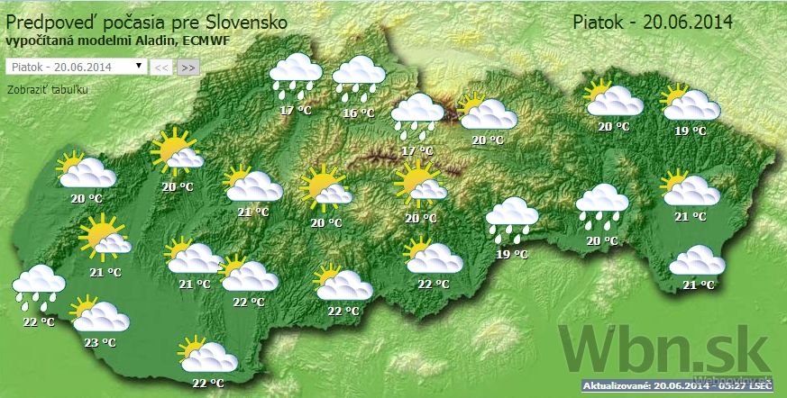 V piatok je premenlivá, časom veľká oblačnosť. Na viacerých miestach sa vyskytnú prehánky, ojedinele aj búrky. Denná teplota dosiahne 19 až 24 stupňov, na severe 14 až 19 stupňov. Fúka severozápadný až severný vietor rýchlosťou 10 až 25, miestami v nárazoch okolo 55 kilometrov za hodinu.