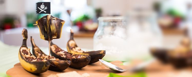 Postup: Banány narežeme do polovice ako loďky a vydlabeme ich lyžičkou. Do otvoru natlačíme kocky čokolády a kúsky keksov. Stlačíme, uzavrieme a pečieme na grile alebo v alobale v pahrebe 2 – 3 minúty. Čokoláda sa roztopí a spojí s teplým banánom. Podávame horúce so studenou šľahačkou alebo so zmrzlinou.