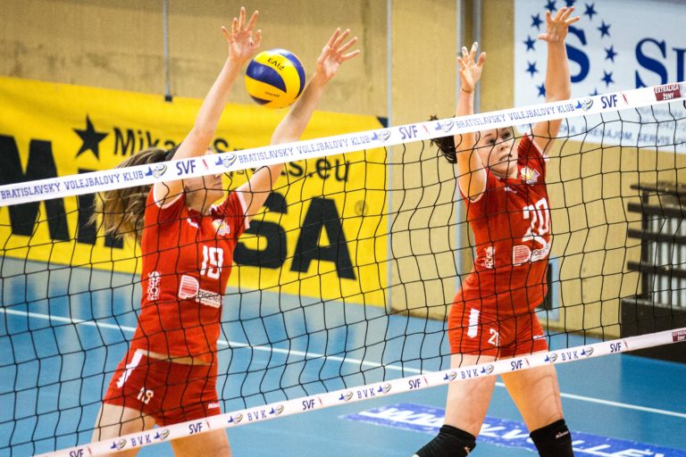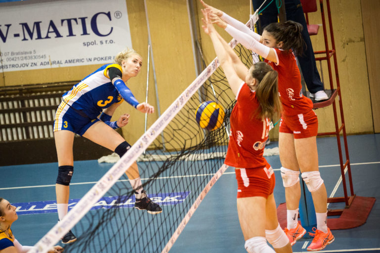 Romana Hudecová z 1. Bratislavského volejbalového klubu (Slovensko) (vľavo) počas zápasu základnej časti MEVZA Cup 2016/2017 žien vo volejbale medzi 1. Bratislavský volejbalový klub (Slovensko) - Mladost Záhreb (Chorvátsko). Bratislava, 28. február 2017. Foto: SITA/Marko Erd