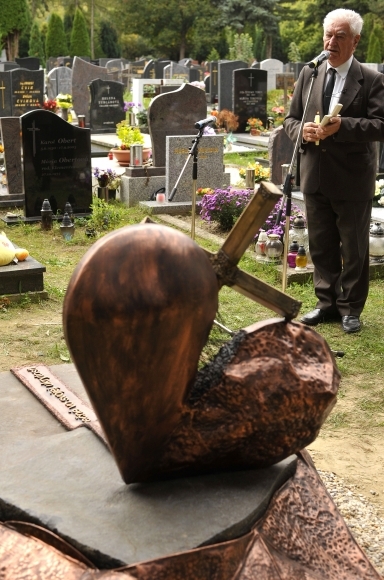 Kňaz Anton Srholec počas odhalenia pomníka pre týrané deti na hrobe utýranej päťročnej Lucky Luknárovej, na Cintoríne Vrakuňa. Pomník v tvare medeného prasknutého srdca symbolizuje utrpenie týraných a zanedbávaných detí, zároveň znázorňuje nádej pre všetky deti s podobným osudom. Foto: SITA/Ján Slovák