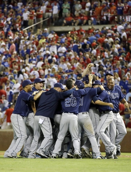 Bejzbalisti Tampa Bay Rays oslavujú víťazstvo 5:2 nad Texas Rangers, ktoré im v americkej lige wild-card zabezpečilo ďalší postup do vyraďovacích bojov proti Cleveland Indians. Foto: SITA/AP
