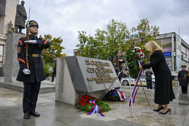 Prezidentka SR Zuzana Čaputová (vpravo) počas položenia venca k Pamätníku československej štátnosti na Námestí T. G. Masaryka v Bratislave pri príležitosti 105. výročia vzniku Československej republiky. Bratislava, 27. október 2023. Foto: SITA/Milan Illík