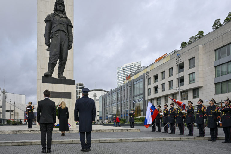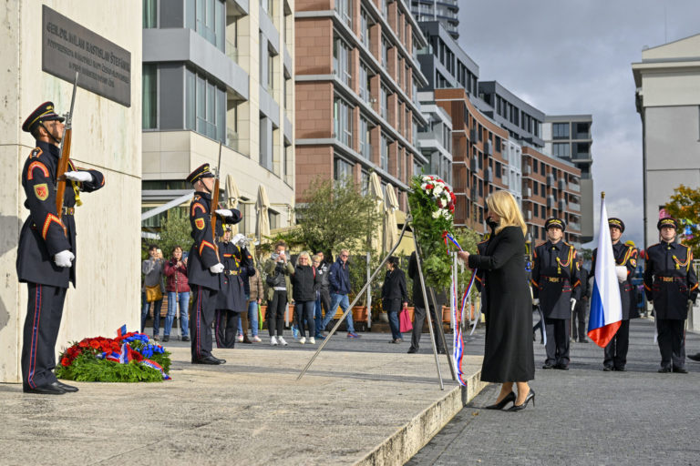 Prezidentka SR Zuzana Čaputová (v popredí vpravo) počas položenia venca k pamätníku M. R. Štefánika v Bratislave pri príležitosti 105. výročia vzniku prvej Československej republiky. Bratislava, 27. október 2023. Foto: SITA/Milan Illík