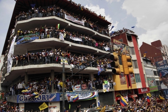 Desiatky prívržencov opozičného kandidáta Henriqua Caprilesa do venezuelských prezidentských volieb sa zhromaždili počas jeho predvolebného mítingu v meste Merida. Kľúčový plebiscit, ktorý rozhodne o novom lídrovi po smrti Huga Cháveza, sa uskutoční v nedeľu. Proti Caprilesovi stojí doterajší viceprezident Nicolas Maduro. Bezpečnostné jednotky štátu bohatého na ropu uzatvorili hranice a v celej krajine sa posilnili bezpečnostné opatrenia. Foto: SITA/AP Photo/Ariana Cubillos