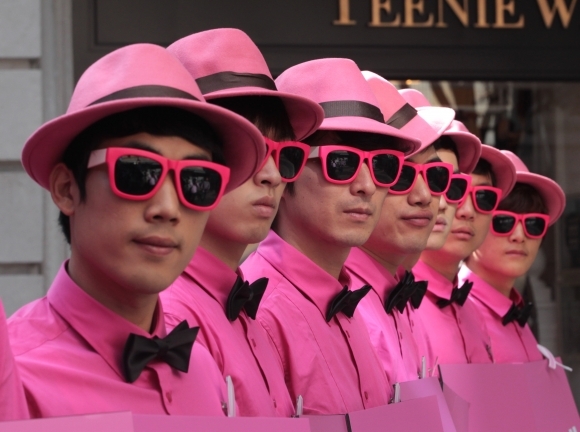 Džentlmeni v ružovom podporujú kampaň proti rakovine prsníka v Južnej Kórei. Foto: SITA/AP