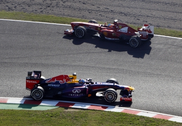 Sebastian Vettel na voze Red Bull (dole) obieha pri tréningu na Veľkú cenu F1 v Japonsku Fernanda Alonsa na Ferrari. Ten sa dostal mimo trať a pri návrate musel v prejsť kúsok trate v protismere. Foto: SITA/AP