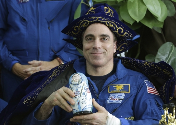 Americký astronaut Chris Cassidy s matrioškou seba samého, počas tlačovej konferencie na letisku v Karagande. Cassidyho a jeho dvoch kolegov doviezla na Zem raketa Sojuz po 166-dňovom pobyte na medzinárodnej vesmírnej stanici ISS. Foto: SITA/AP