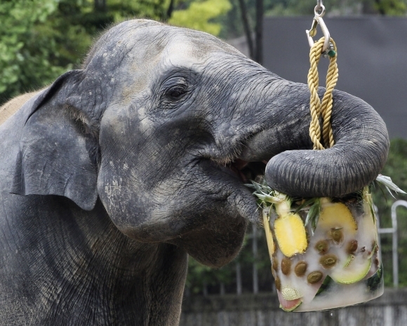 Slony i ďalšie zvieratá v juhokórejskej ZOO v Soule si môžu pochutnať na zmrznutom ovocí, ktorým sa pracovníci ZOO snažia zmierniť obrovské teplá, ktoré sužujú jej obyvateľov. Foto: SITA/AP
