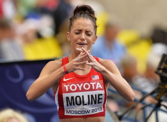 Američanka Georganne Moline spína ruky potom, čo v rozbehu na 400 m prekážok na Majstrovstvách sveta v atletike v Moskve dobehla na poslednom mieste. Foto: SITA/AP