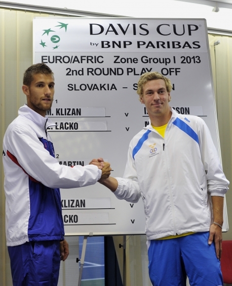 Slovenský tenista Andrej Kližan a švédsky tenista Isak Arvidsson po vylosovaní žrebu 1. kola play-off o zotrvanie v I. skupine euroafrickej zóny Davisovho pohára. Foto: SITA/Ján Slovák