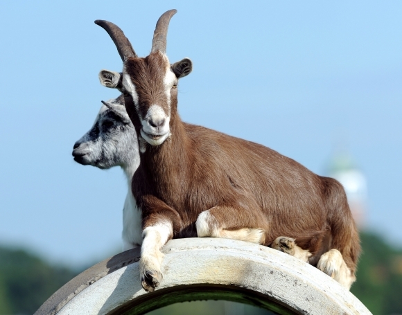 Dve mladé kozy sa vyšplhali na betónový oblúk, aby si lepšie vychutnali slnečné lúče. Foto: SITA/AP