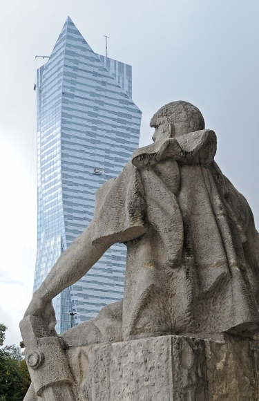 Socha na varšavskej ulici, ktorá pripomína komunistickú éru Poľska, a v pozadí výšková veža navrhnutá americkým architektom Danielom Libeskindom. Z budovy je krásny výhľad na celú Varšavu a vo štvrtok tam otvorili nové marketingové centrum a apartmány s interiérmi z tmavého dreva a bieleho mramoru. Foto: SITA/AP