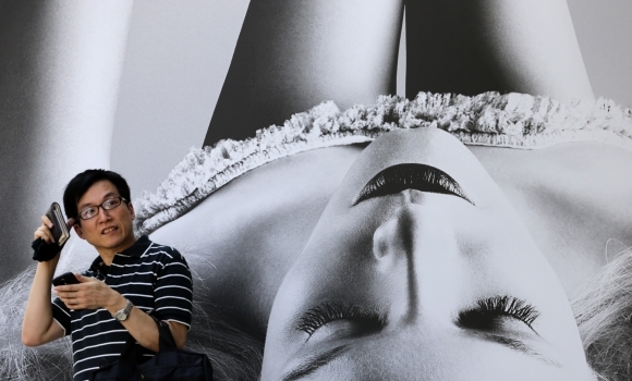 Muž s mobilom prechádza okolo obrovskej reklamy jedného z butikov v Tokyu. Foto: SITA/AP