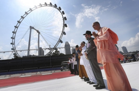 Pri príležitosti nadchádzajúcej ceny Formule 1 sa v Marina Bay City streli vodcovia desiatich rozličných náboženstiev, čím ukázali, že aj napriek odlišnostiam môžu mať spoločné záujmy. Foto: SITA/AP