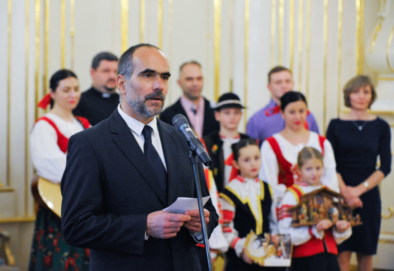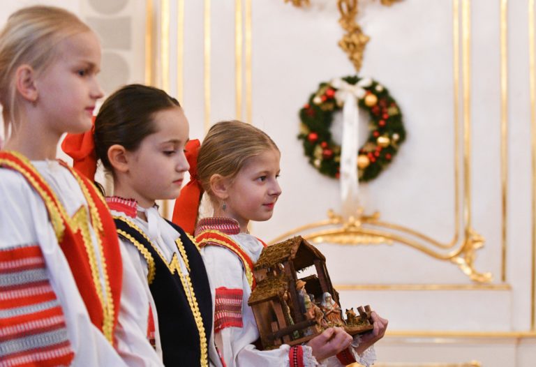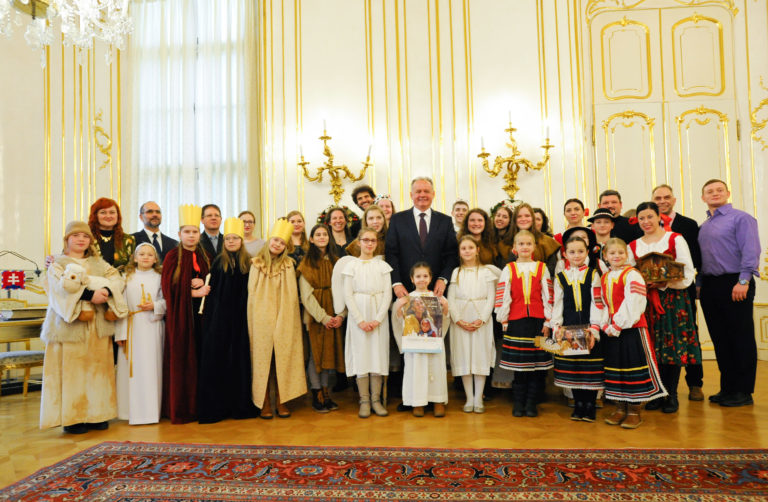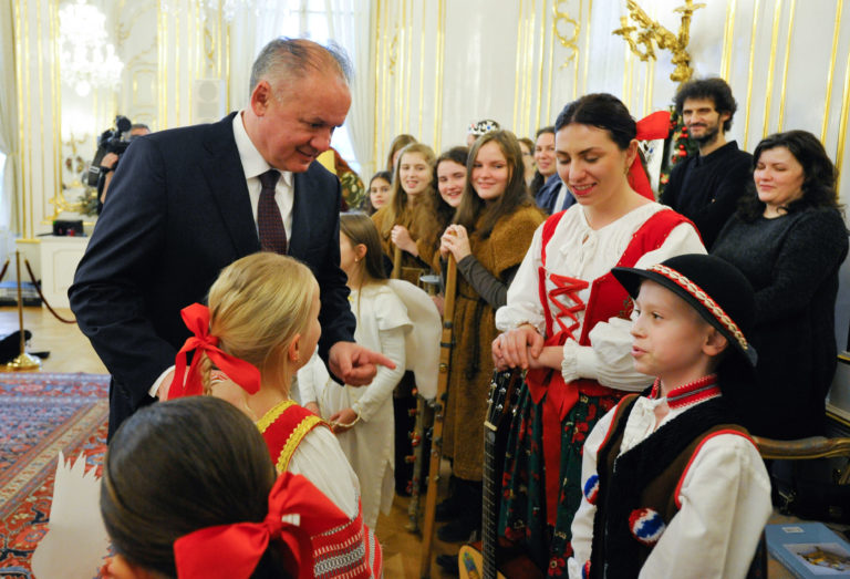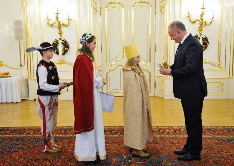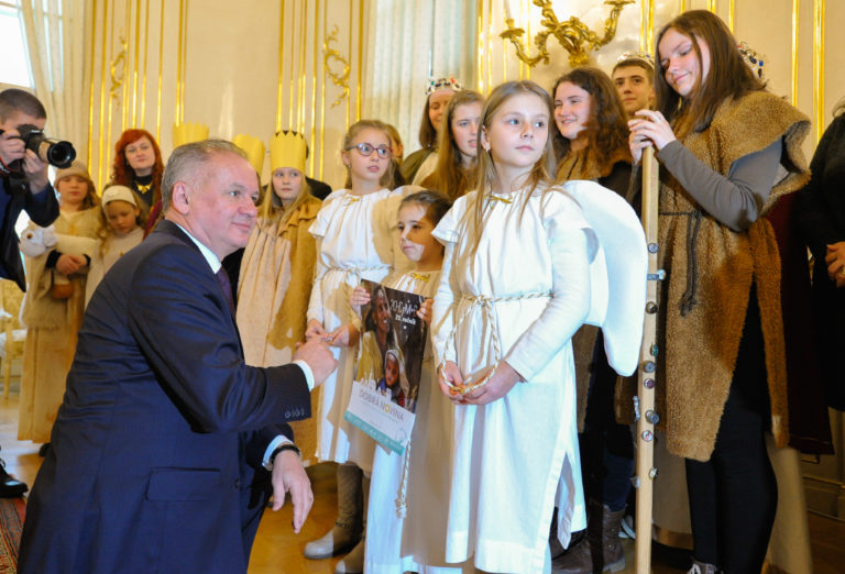 Prezident SR Andrej Kiska a koledníci Dobrej noviny počas prijatia v Prezidentskom paláci. Foto: SITA/Martin Medňanský
