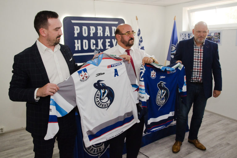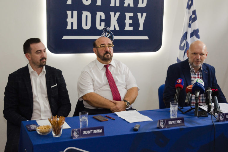 Zľava: Výkonný riaditeľ HK Poprad Ľudovít Jurínyi, čestný prezident HK Poprad Jan Telensky a konateľ HK Poprad Neklan Herold počas predsezónneho brífingu hokejového klubu HK Poprad. Poprad, 13.9 2018. Foto: SITA/Radoslav Maťaš.