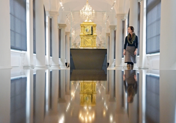 Drážďanské múzeum otvorilo v týchto dňoch výnimočnú výstavu historických hodín. Na snímke sú vzácne astronomické hodiny (1563-1568), ktoré vlastnil Eberhard Baldewein. Foto: SITA/AP Photo/Jens Meye