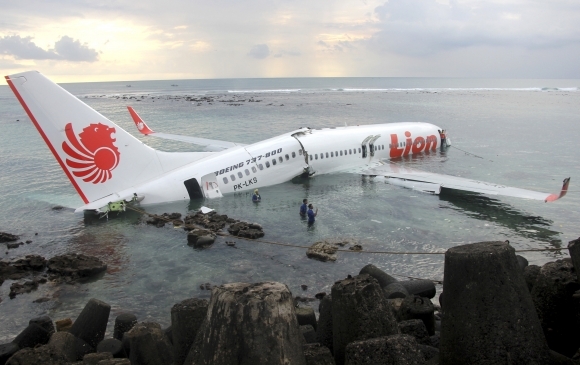 Lietadlo indonézskej nízkonákladovej spoločnosti Lion Air nezvládlo v sobotu pristávací manéver na obľúbenom turistickom ostrove Bali a skončilo v mori. Napriek tomu však všetci cestujúci prežili. Boeing 737 nachádza v plytkej vode asi 200 až 300 metrov od pristávacej dráhy letiska v Denpasare. Vláda už predtým oznámila, že všetkých 172 cestujúcich je v poriadku, len niekoľkí utrpeli ľahké zranenia. Foto: SITA/AP Photo/Indonesian Police