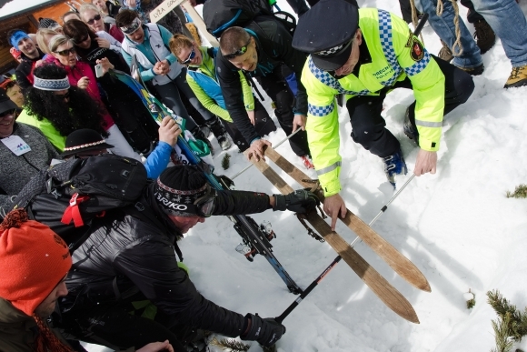 Účastník 2. ročníka netradičných skialpinistických pretekov Krčmár Skap prichádza do cieľa na Štrbskom Plese. Foto: SITA/Radoslav Maťaš