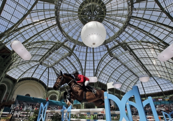 Švajčiarsky jazdec Pius Schwizer s koňom Powerplay počas parkúrovej súťaže v parížskom Grand Palais. Foto: SITA/AP Photo/Francois Mori