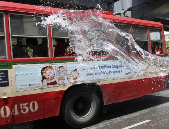 Deti v Bangkoku oblievajú cestujúcich v autobuse v rámci tradičného jarného festivalu Songkran, ktorým krajina oslavuje Thajský Nový rok. Foto: SITA/AP Photo/Sakchai Lalit