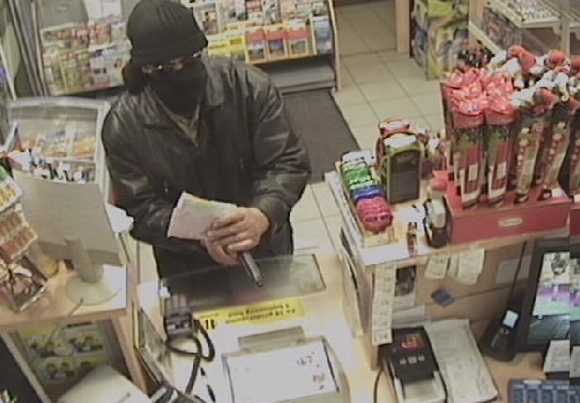 Ozbrojený muž (na snímke) lúpil nadránom na jednej z trebišovských čerpacích staníc. Odniesol si 1600 eur. Páchateľ bol asi 170-180 cm, zavalitej postavy, mal výrazné čierne obočie. Maskoval sa čiernou šatkou, čiernou čiapkou a okuliarmi. Mal zvláštnu kolísavú chôdzu. Foto: SITA/KR PZ Košice