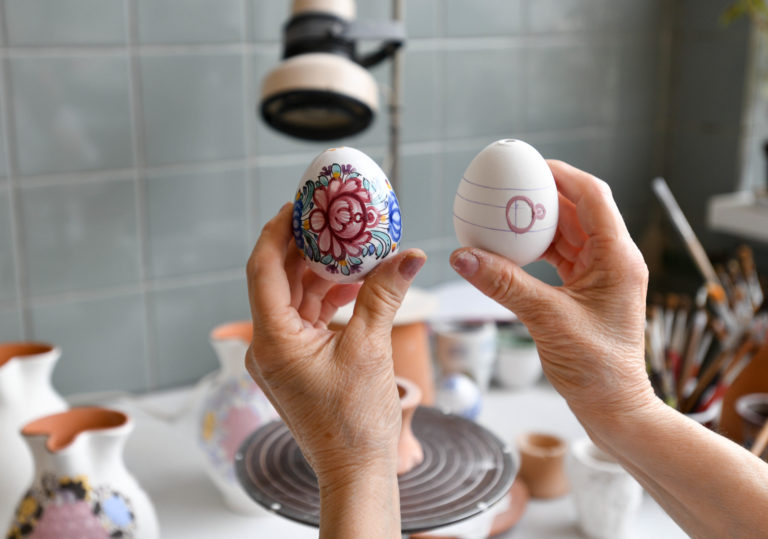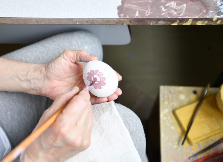 Maliarka Mária Köplingerová maľuje veľkonočné vajíčko z keramiky, vo výrobných priestoroch Slovenskej ľudovej majoliky v Modre. Slovenská ľudová majolika si pripomína 140. výročie jej založenia. Modra, 30. marec 2023. Foto: SITA/Martin Medňanský.