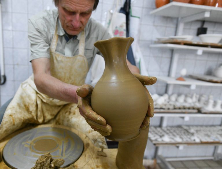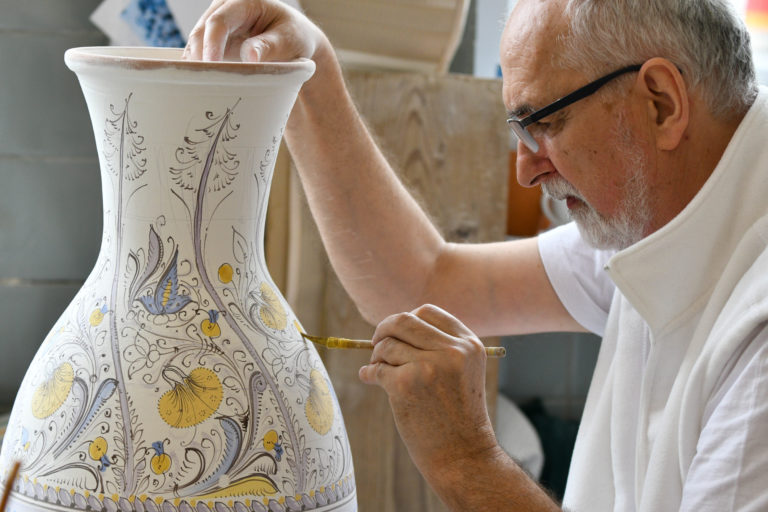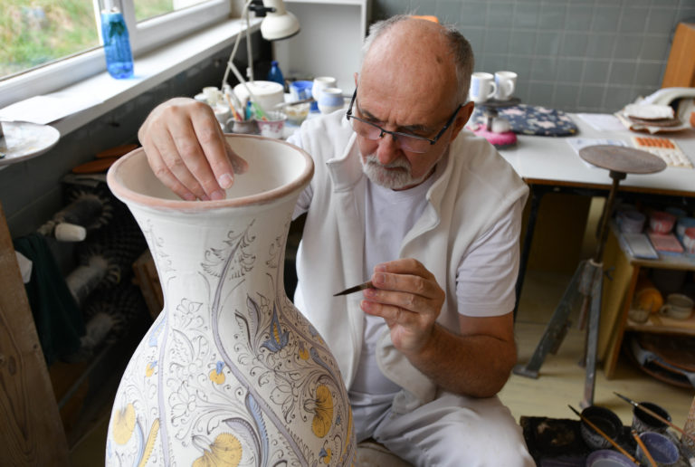 Maliar Juraj Hanulík počas práce na váze, vo výrobných priestoroch Slovenskej ľudovej majoliky v Modre. Slovenská ľudová majolika si pripomína 140. výročie jej založenia. Modra, 30. marec 2023. Foto: SITA/Martin Medňanský.