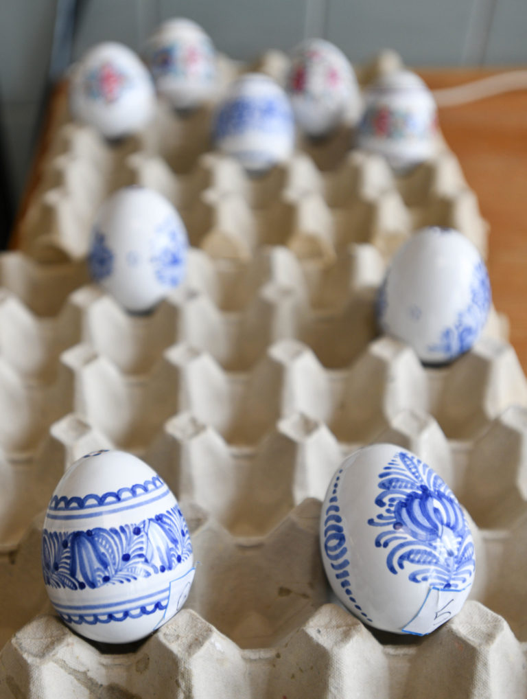 Pohľad na veľkonočné vajíčka z keramiky vo výrobných priestoroch Slovenskej ľudovej majoliky v Modre. Slovenská ľudová majolika si pripomína 140. výročie jej založenia. Modra, 30. marec 2023. Foto: SITA/Martin Medňanský.