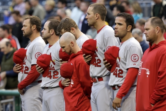 Bejzbalisti tímu zámorskej MBL St. Louis Cardinals si spoločne s celým štadiónom v Pittsburghu uctili pred zápasom s domácimi Pirates pamiatku obetí teroristických útokov počas Bostonského maratónu. Foto: SITA/AP Photo/Gene J. Puskar