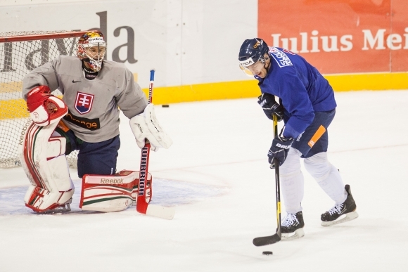 Sprava: Slovenský hokejový reprezentant Miroslav Šatan a brankár hokejovej reprezentácie Július Hudáček počas tréningu pred ďalšou fázou prípravy na MS 2013 v Bratislave. Foto: SITA/Jozef Jakubčo
