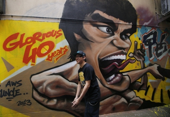 Legendárny bojovník kung-fu Bruce Lee na grafiti pred Múzeom dedičstva v Hong Kongu. V múzeu je pri príležitosti 40. výročia jeho úmrtia nainštalovaná expozícia pripomínajúca populárneho karatistu. Foto: SITA/AP