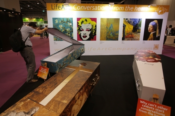 Návštevník nakúka do truhly na 6. Ázijskej konferencii o pohrebníctve v Hong Kongu. Na sprievodnej výstave sa predstavuje 2000 firiem. Foto: SITA/AP