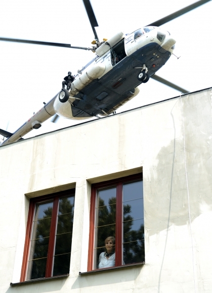 Atlas Common Challenge 2013 - medzinárodné cvičenie elitných protiteroristických jednotiek na Slovensku. Fiktívny útok teroristov na budovu školy sa konal na Súkromnej strednej odbornej škole v Kolárove. Foto: SITA/Martin Havran