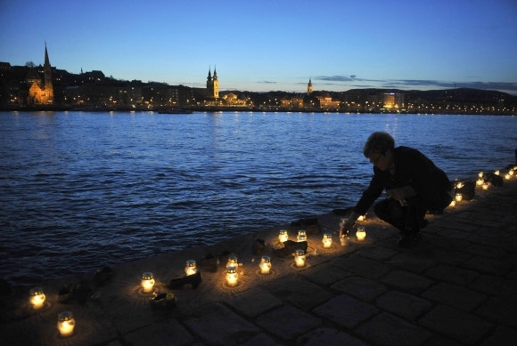 Žena zapaľuje pri Dunaji v maďarskej metropole Budapešť sviečku za obete holokaustu. Foto: SITA/AP Photo/MTI, Noemi Bruzak