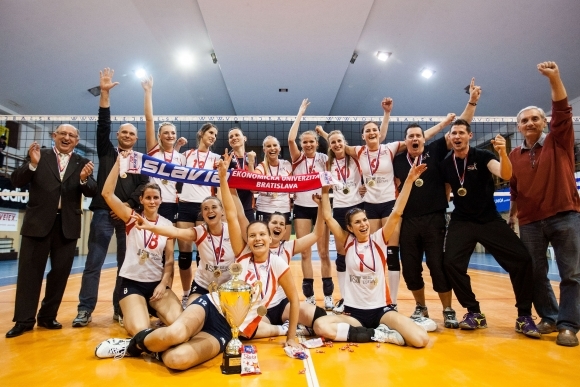 Volejbalistky Slávie EU Bratislava sa štrnástykrát stali majsterkami Slovenska. V stredajšom štvrtom strhujúcom zápase finále play-off zvíťazili na ihrisku svojho mestského rivala a obhajcu titulu z predchádzajúcej sezóny VK Doprastav 3:2 (-18, -20, 22, 23, 5) a v celej sérii triumfovali 3:1. Foto: SITA/Jozef Jakubčo