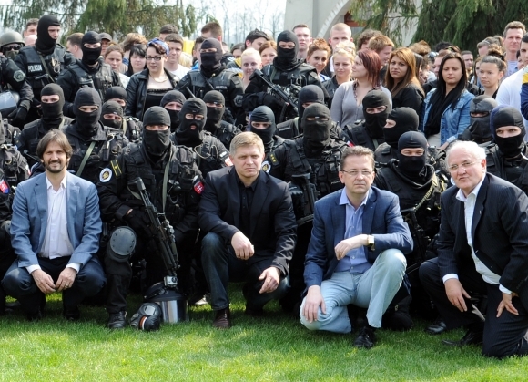 Sprava v prvom rade: Minister školstva, vedy, výskumu a športu Dušan Čaplovič, minister obrany Martin Glváč, predseda vlády Robert Fico a minister vnútra Robert Kaliňák (vľavo) na spoločnej fotografii po skončení podujatia Atlas Common Challenge 2013 - medzinárodné cvičenie elitných protiteroristických jednotiek na Slovensku. Fiktívny útok teroristov na budovu školy sa konal na Súkromnej strednej odbornej škole v Kolárove. Foto: SITA/Martin Havran