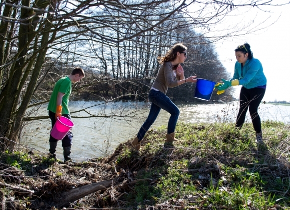 Študenti gymnázia zo Zlatých Moraviec počas prenášania žiab druhu ropuchy bradavičnatej cez cestu do rybníka v obci Jelenec. Ropucha bradavičnatá (Bufo bufo) je jedným z druhov obojživelníkov, ktorého dospelé jedince na jar migrujú zo zimovísk na miesta rozmnožovania. J Foto: SITA/Martin Havran