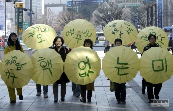 Juhokórejskí environmentálni aktivisti pochodujú ulicou v centre Soulu so žltými dáždnikmi, na ktorých sú písmená tvoriace nápis „bezatómová Zem“. Aktivisti žiadajú juhokórejskú vládu aby odstavila nukleárne zariadenia v krajine. V Južnej Kórei, geograficky najbližšom susedovi Japonska, rastie nervozita z vývoja v jadrovej elektrárne Fukušima na severe Japonska. Foto: AP Photo/Ahn Young-joon