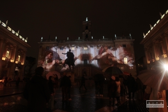 Počas celej dnešnej noci sú na steny paláca Senatorio na Kapitolskom námestí v Ríme premietané výjavy z talianskej histórie. Taliansko dnes oslavuje 150. výročie zjednotenia krajiny. Za oficiálny dátum zjednotenia sa pokladá 17. marec 1861, kedy na trón zasadol kráľ Viktor Emmanuel II., prvý kráľ zjednotenej krajiny. Dovtedy bol Apeninský polostrov rozdelený na obrovské množstvo malých kráľovstiev, mestských a pápežských štátov. Foto: AP Photo/Gregorio Borgia