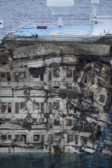 Detail pravej strany vraku lode Costa Concordia, ktorá stroskotala v januári 2012 neďaleko talianskeho pobrežia. V noci na utorok sa počas náročnej operácie podarilo uvoľniť loď z útesu a narovnať. Najnáročnejšia operácia svojho druhu s nákladmi 750 miliónov eur trvala jediný deň. Vrak vážiaci 114,5 tisíca ton vrátili do zvislej polohy. Foto: SITA/AP