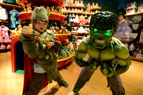 Osemročný Jackson Oliver Fox oblečený ako legendárny hrdina Thor a jeho kamarát James Nenninger ako Hulk na Disney Store’s Halloween BOOtique Party v Kalifornii. Foto: SITA/AP