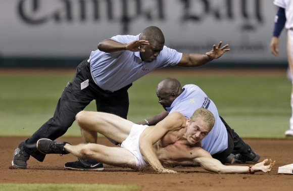 Ochrankári na štadióne v Tampa Bay zasahujú proti fanúšikovi, ktorý sa sporo odetý rozhodol uprostred bejzbalového zápasu medzi Tampou a Texasom obehnúť všetky méty. Už na druhej ho však skolili strážcovia poriadku. Foto: SITA/AP