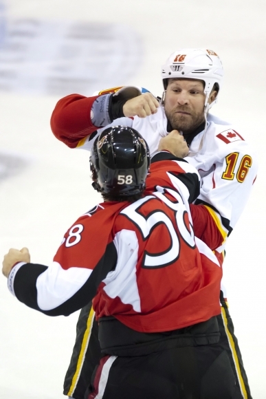 Hokejisti v NHL berú aj prípravné zápasy veľmi vážne. V zápase Ottawa - Calgary si to už v prvej tretine na tvrdo rozdali Michael Sdao a Brian Mcgrattan. Foto: SITA/AP