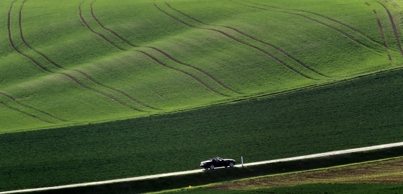 Kabriolet prechádza po pri zelených poliach neďaleko nemeckého mesta Remlingen. Do krajiny, po nezvyčajne dlhej a chladnej zime, zavítalo pravé jarné počasie. Foto: SITA/AP Photo/dpa, Karl-Josef Hildenbran