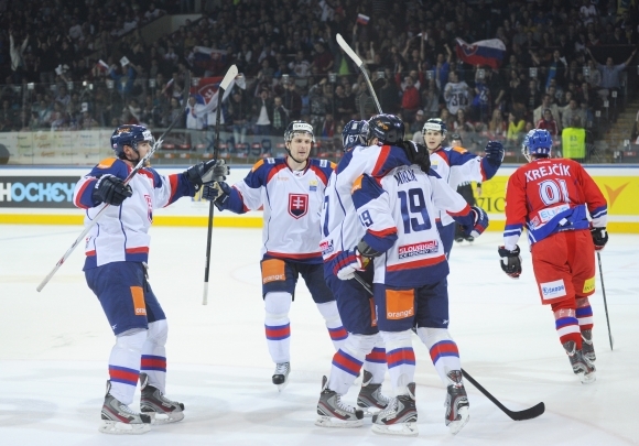 Slovenská hokejová reprezentácia zvíťazila v jubilejnom 500. stretnutí svojej histórie v Prahe v rámci Euro Hockey Challenge nad Českom 3:2. V 56. vzájomnom derby vyhral slovenský výber dvanástykrát. Oba tímy sa opäť stretnú v sobotu 20. apríla od 19.00 h na Zimnom štadióne Ondreja Nepelu v Bratislave. Slováci nastúpili proti Čechom po prvý raz od vlaňajšieho úspešného semifinále majstrovstiev sveta v Helsinkách (3:1). Foto: SITA/Marián Peiger