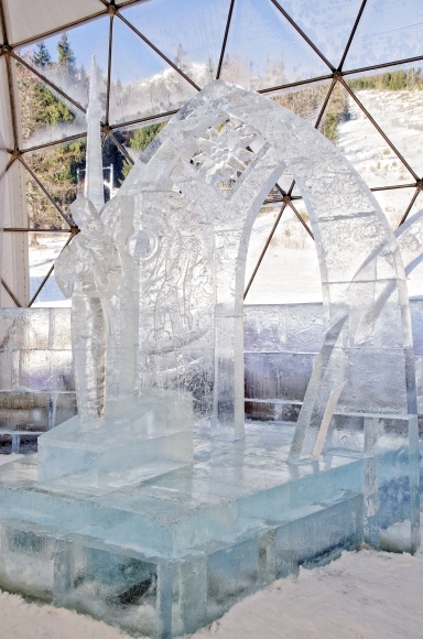 Interiér Tatranského ľadového dómu počas posledných úprav pred svadobným obradom. Chrám z ľadu stojí na Hrebienku a jeho autorom je spolu s ďalšími kolegami plzenský sochár František Bálek, ktorý sa plánuje v chráme oženiť. Tatranský ľadový dóm bude po sobáši atrakciou pre všetkých návštevníkov Tatier. Foto: SITA/Radoslav Maťaš