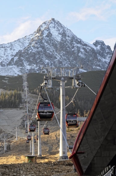 Zaťažkávacia jazda novej kabínovej lanovky na trase Štart - Skalnaté pleso vo Vysokých Tatrách. Foto: SITA/Radoslav Maťaš
