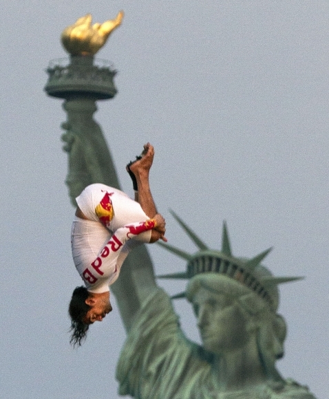 Kolumbijský kaskadér Orlando Duque predvádza pred Sochu slobody saltá po skoku z helikoptéry v rámci proma na súťaž Red Bull Cliff Diving World Series. Foto: SITA/AP